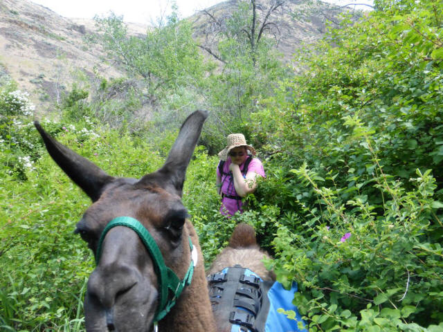 Memorial Day Weekend 2016May 27-30, 2016. (Friday - Monday) The Umtanum recreation site is located in the scenic Yakima River Canyon, 12 miles south of Ellensburg, Washington, which cuts through massive basalt cliffs and rolling desert hills. This canyon has been designated as a state scenic route and offers excellent wildlife viewing, fishing in a Blue Ribbon trout stream, family river rafting and camping. A wooden and steel suspension footbridge crosses the Yakima River at this site, providing the only access to the west side of the river in the Yakima River Canyon. The west side of the river consists mainly of BLM and Washington Department of Fish and Wildlife managed lands. For more details about the site, see Umtanum Creek2015 With the varied terrain and obstacles, this is an excellent llama training site. King Asher's Legado (2 years old) and Prince Robin Williams (under 2 years old) accompanied us for their first excursion. We were very pleased with their performance, completing a large number of first-time experiences without difficulty. They both took to it like naturals. Without any prior towel training or other props, they saddled easily, just standing in place through the entire process. Both sported the smaller (but just like it's bigger cousin) Flaming Star "Trail Boss" pack system. Being young and their first time, they weren't carrying much weight -- just a few pounds in each pannier. Of course the first significant obstacle is the suspension bridge crossing. It was rather windy so the bridge was swaying and bouncing. There is a narrow entry gate to the bridge to block other than foot traffic so normal sized panniers have to be removed and reattached to get onto the bridge landing. Water crossings, including thigh deep, were handled without much trepidation, even though they had never before seen open or moving water. Of course brushy obstacles, including some thorny wild rose, was no problem. Tying out was no problem, either high line on the treks or on ground tether while at base camp. Figuring out ground tethers is a difficult challenge for llamas but neither of them managed to get into any serious trouble. Of course the eleven llamas drew considerable attention wherever they went. There were quite a few dogs around which were concerning to the llamas, providing one of the most difficult challenges of all. While tied out Robin did attack one large dog that was approaching Legado when Legado had managed to short-tie himself to a tree and was quite defenseless. None of the dogs acted aggressively and most were on leash or carried. It provided quite a few stepping off the trail exercises. The boys also loaded onto the van for the first time without trouble, each taking about a minute to figure it out -- Robin first and then Legado, which is a high jump up with only the aid of a knee board. They rode comfortably with no fuss whatsoever -- getting along fabulously and valuing each other's company. All-in-all our youngsters generally behaved as though they have been packing for years. It helped to have a couple of experienced packers to mentor the llamas-in-training, which could be emulated. Llamas learn very rapidly simply by seeing something demonstrated. That's the primary purpose of this training opportunity. For those that missed it this year, you missed out on a great event! |