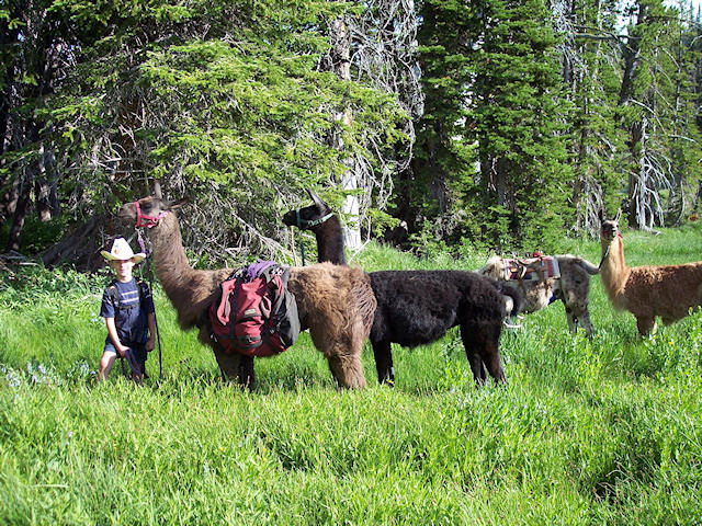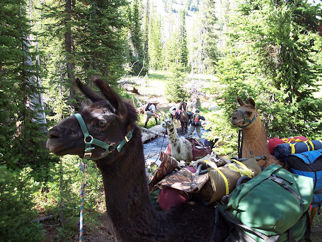 Hiking in requires a few water crossings.  Lots of grass to eat everywhere.  Cassidy leads a pair of llamas.