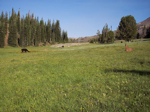 The llamas browse and relax in a meadow near the northern Bonnie Lake.  Joyce and Cassidy raft on the lake.
