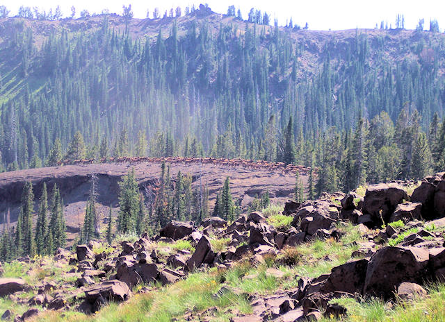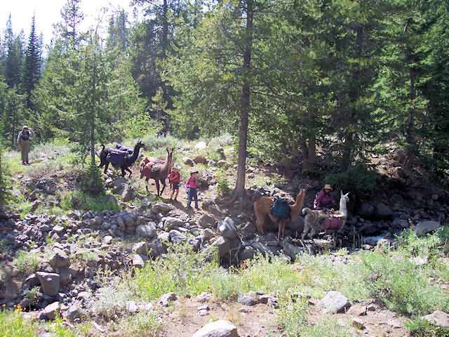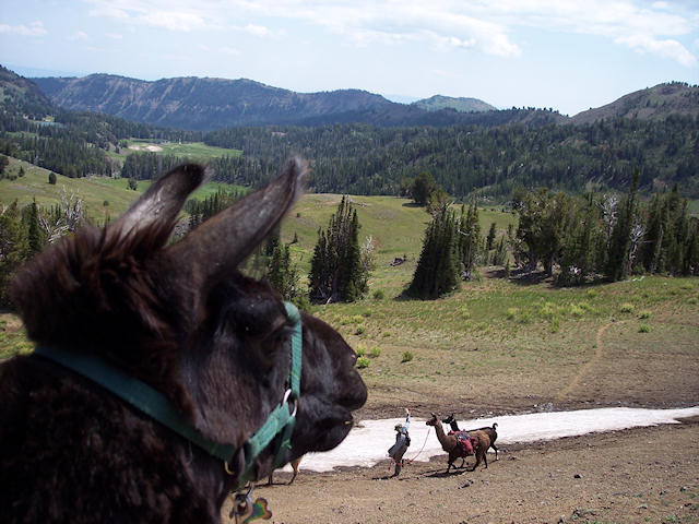 Looking back towards Bonnie Lakes while Julie demonstrates to the attentive llamas how to walk with style and elegance.  Taking a picnic break north of Dollar Lake, looking south.