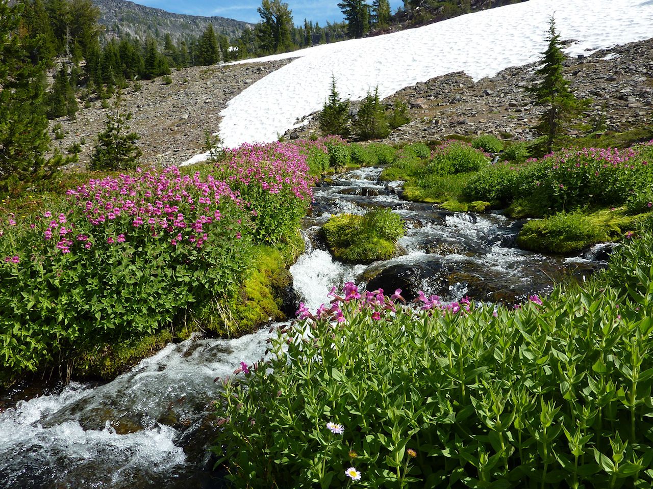 The trek back, with North Sister as a backdrop. Flowers in bloom.