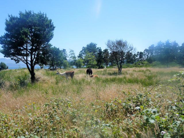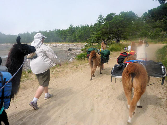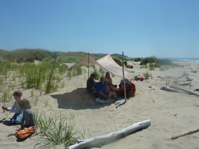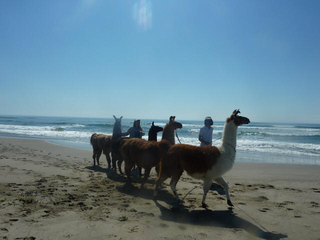 A late July pack trip to the tip of Cape Meares, Oregon -- the first campout with llamas on the Pacific coastline -- accompanied by grandkids, and Joyce and Julie. Marley, Rowdy and Xerox did our packing duty. It was only the second time out for Rowdy and Xerox. They did great. Unfortunately, the grandkids damaged the camera so few pictures survived, of poor quality. The llamas enjoyed the beach and didn't mind the kite flying at all, but unlike the kids had no real desire to play in the ocean. |